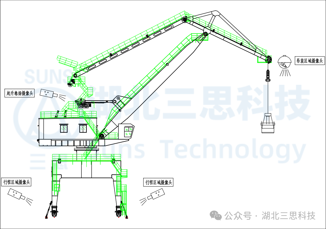 ▲門座式起重機(jī)安全監(jiān)控系統(tǒng)攝像頭安裝示意圖