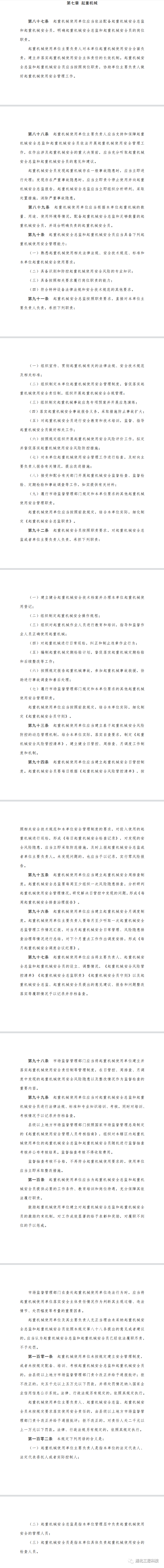 以下是《特種設(shè)備使用單位落實(shí)使用安全主體責(zé)任監(jiān)督管理規(guī)定》第七章針對(duì)起重機(jī)械做出如下規(guī)定:
